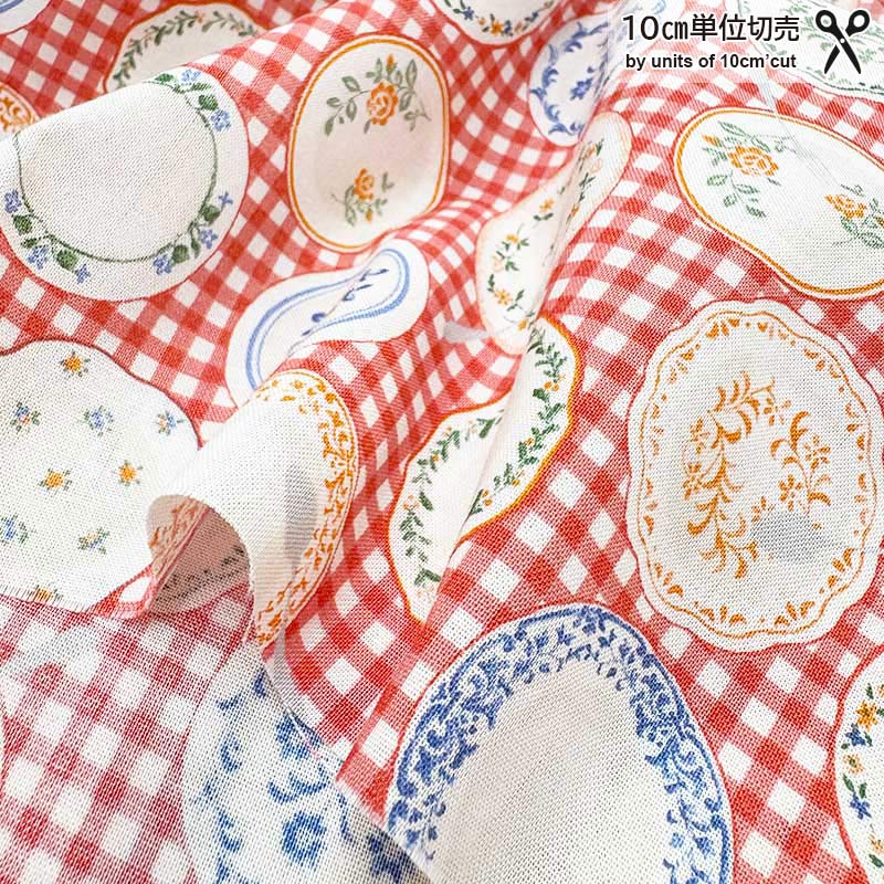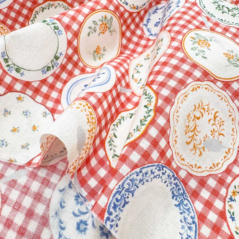 Cotton print fabric with classic plate pattern.