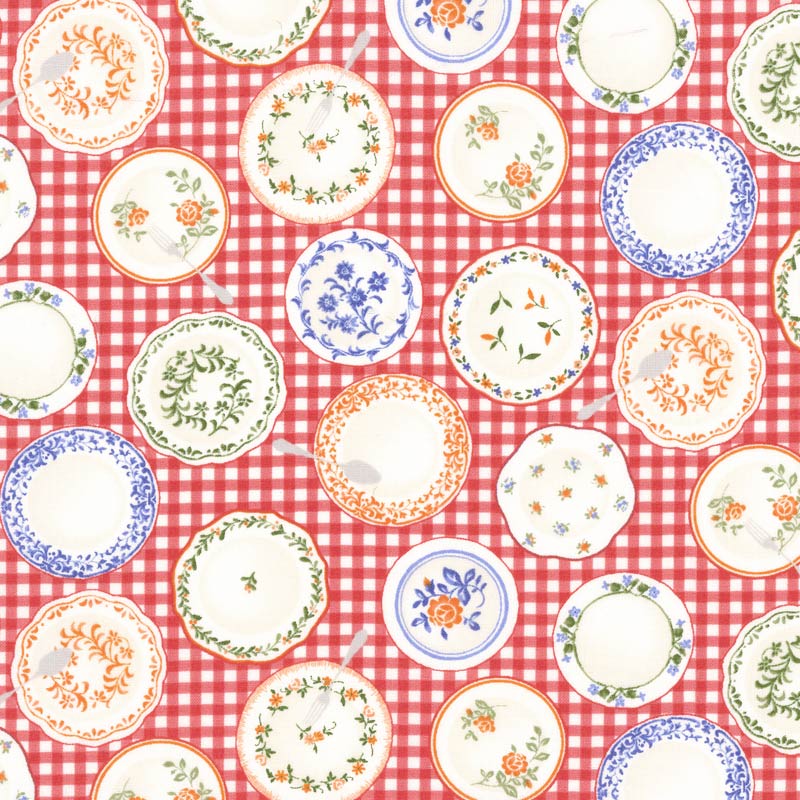 The design features a row of colorful plate motifs against a red gingham check background, creating a nostalgic and warm atmosphere.