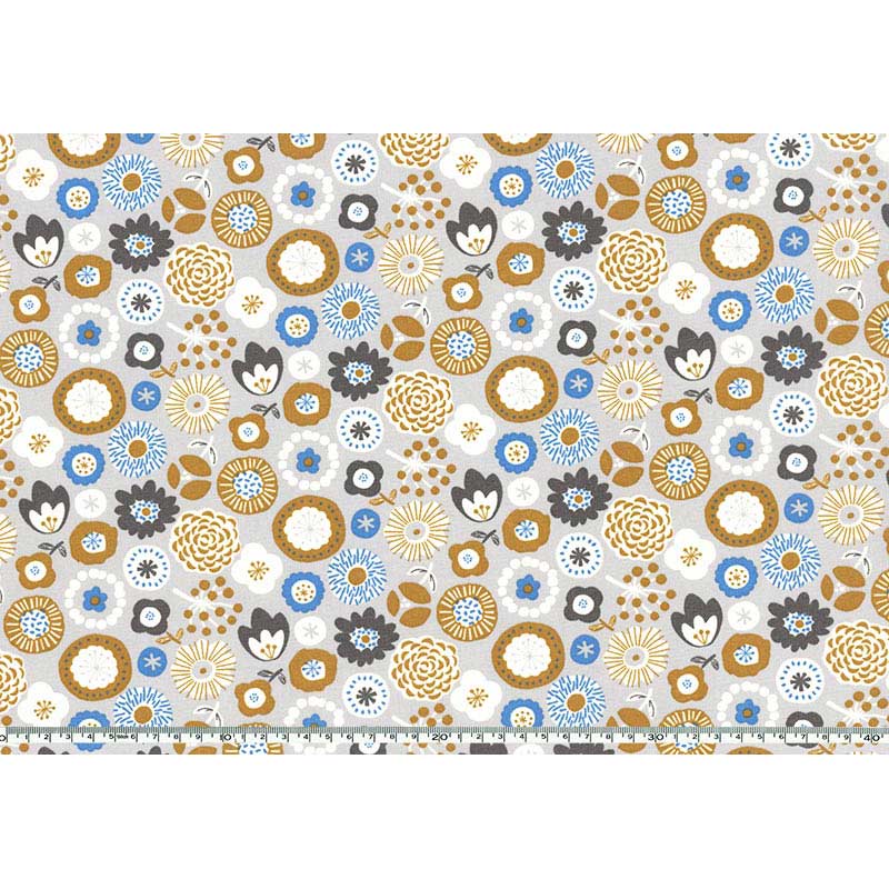 Print fabric with flowers in blue, ecru, gold brown on a gray pale gray.