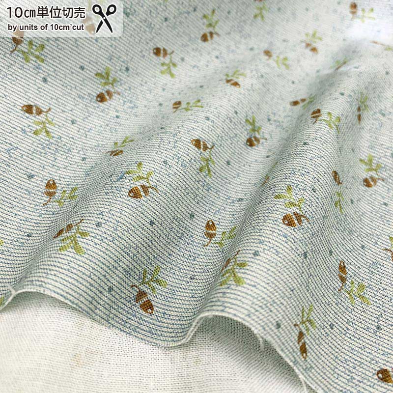 Print fabric with small acorns on a fine striped background in gentle blue.