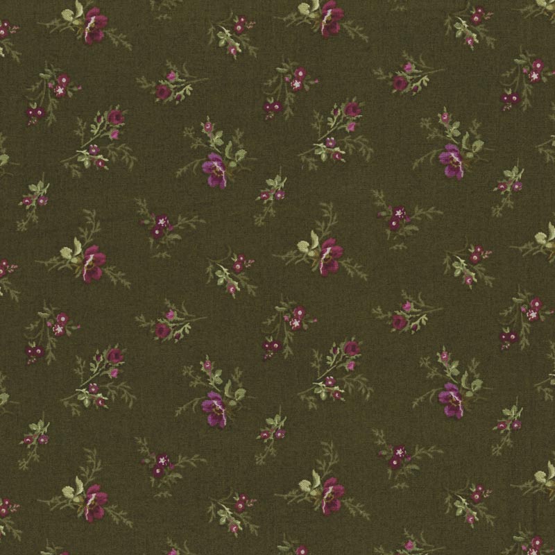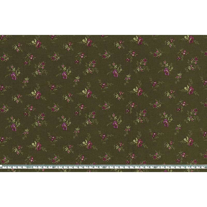 USA print fabric with purple rose on a dark brown background.