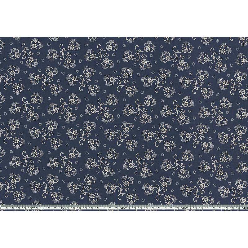 USA print fabric with flowers drawn with ecru lines on a dark blue background.