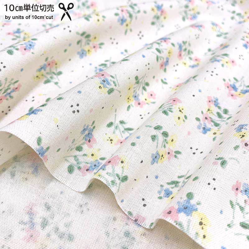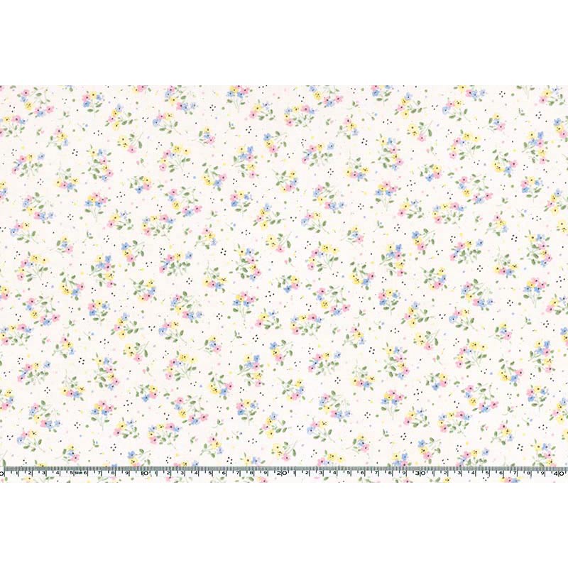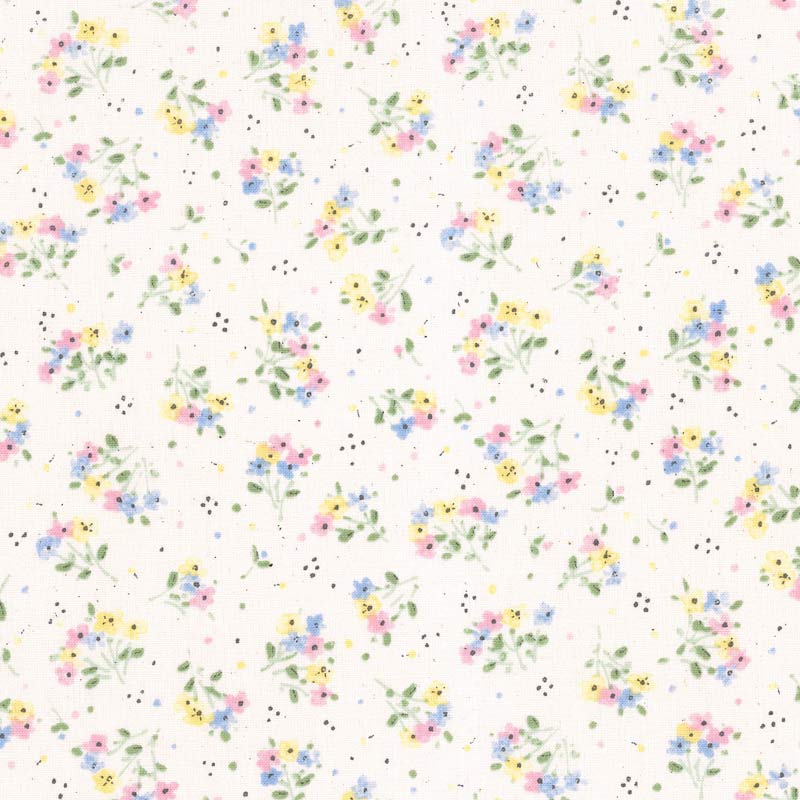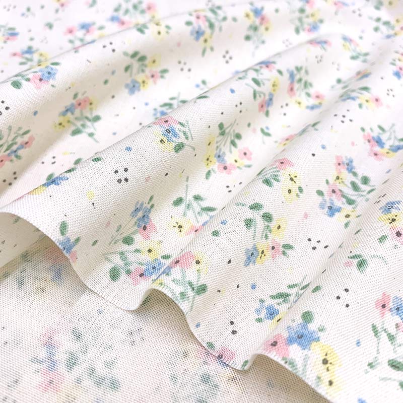 Print fabric with small flowers in pink, water blue, yellow on an ecru background.
