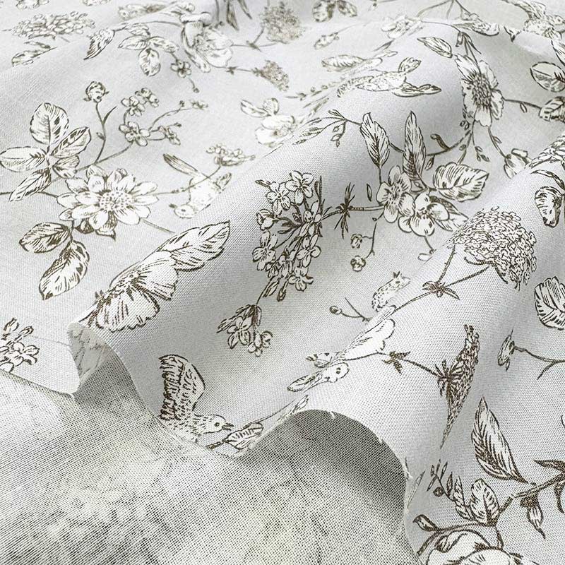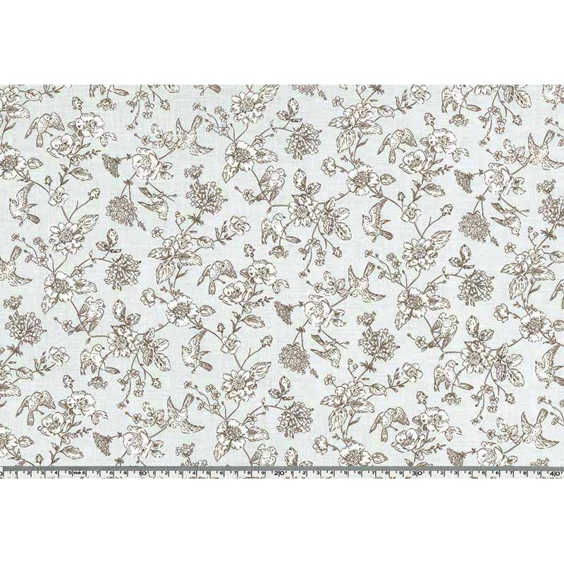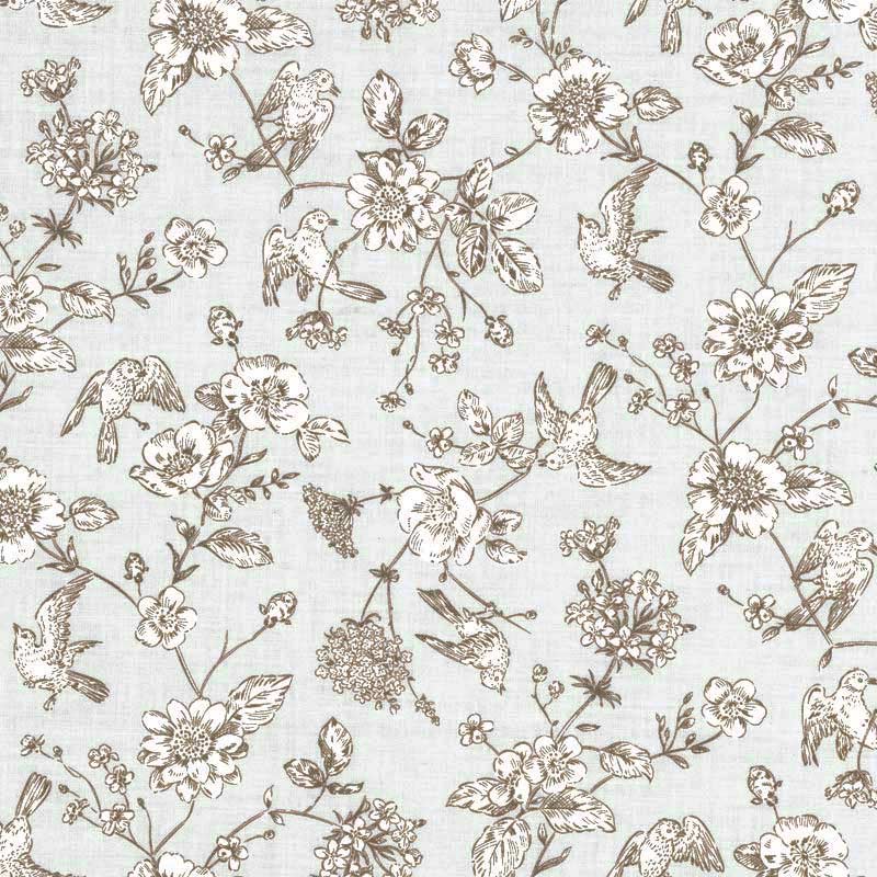 Cotton print fabric with classic flowers and birds with delicate brown lines on a gray background.