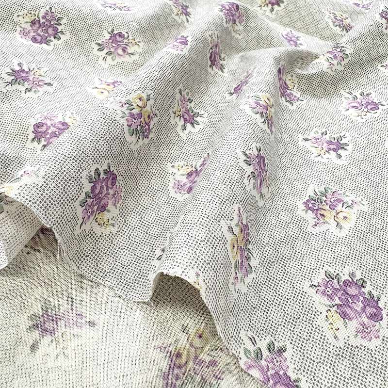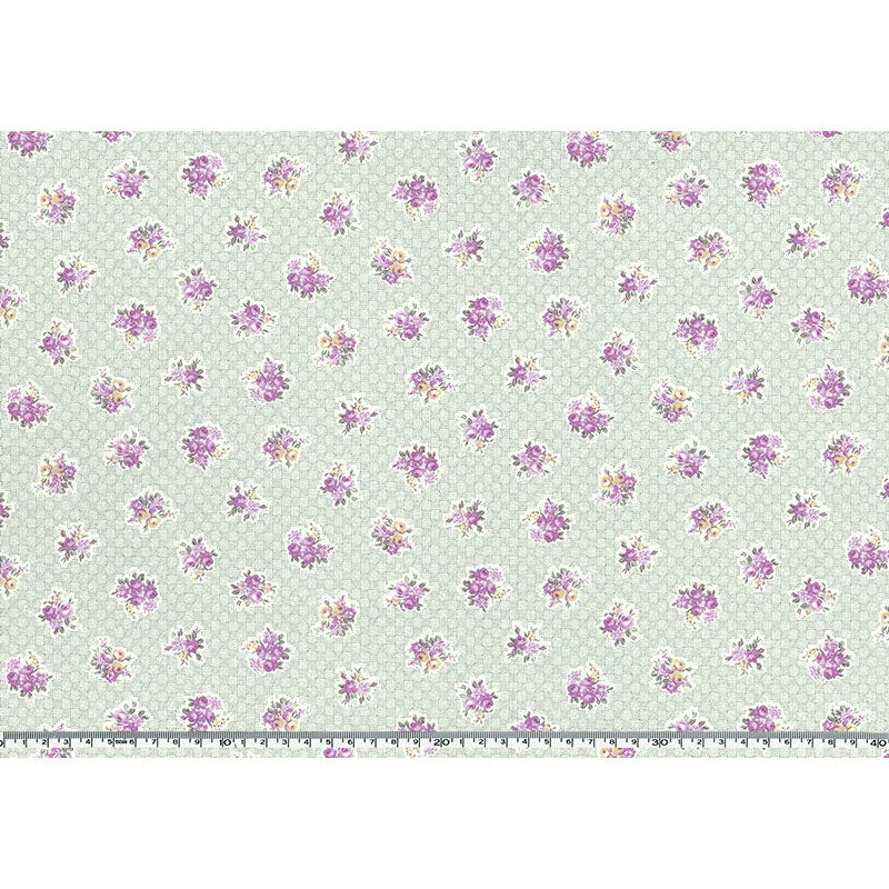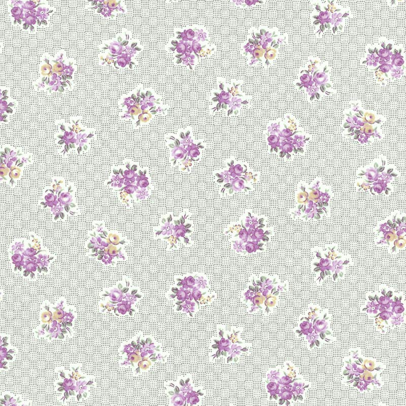 Cotton print fabric with purple bouquet on a fine gray checkered background.
