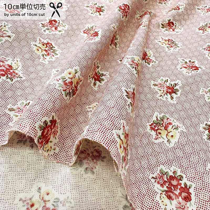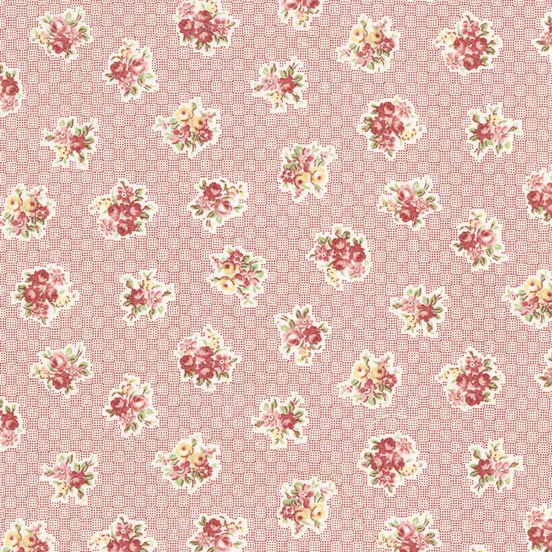 Cotton print fabric with calm rose-colored bouquets on a subtle pink grid background.