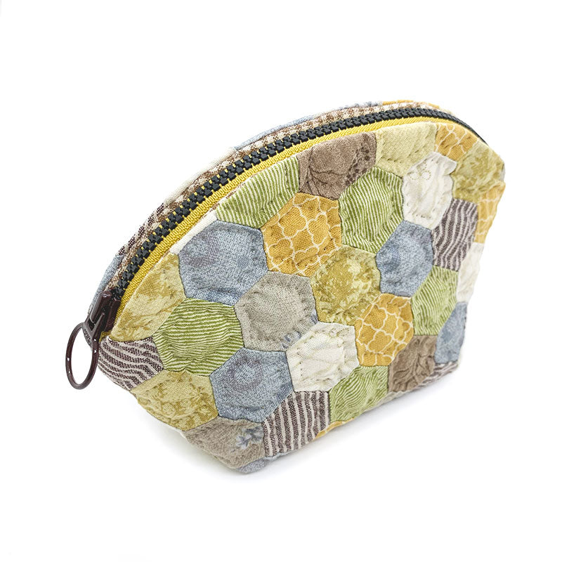 Kit contents: Fabrics (hexagon pieces, backing), color zipper, English instruction, photograph