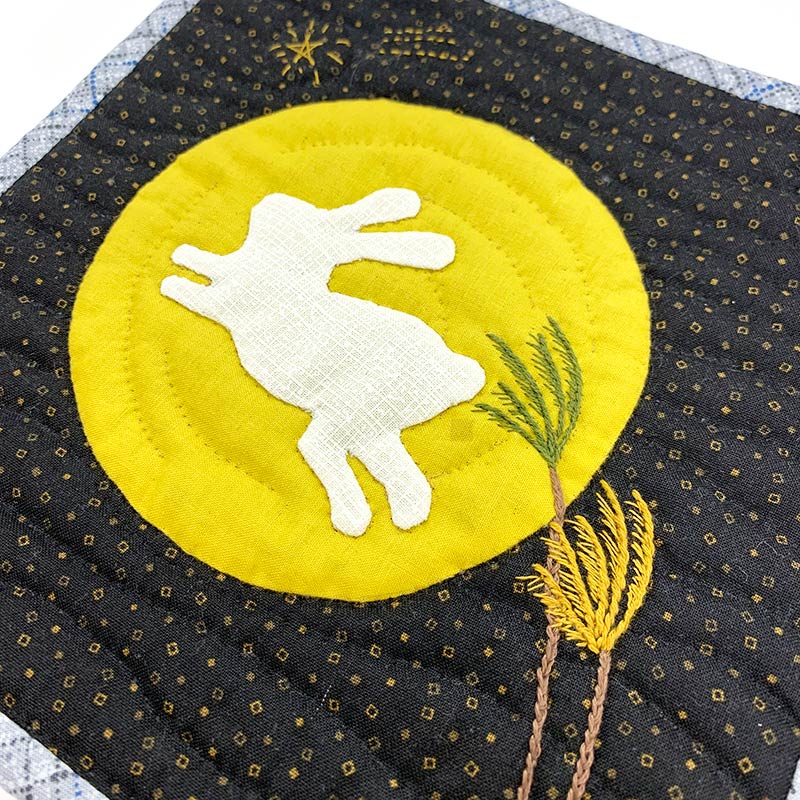 Kit contents: Fabrics (base, moon, rabbit, backing, binding), embroidery thread, cord, English instruction, photograph