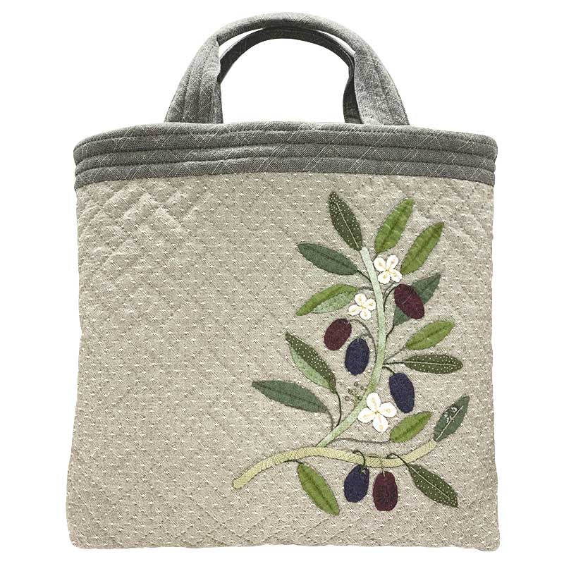 It is the simply designed tote bag with appliques of olive fruit and leaves.