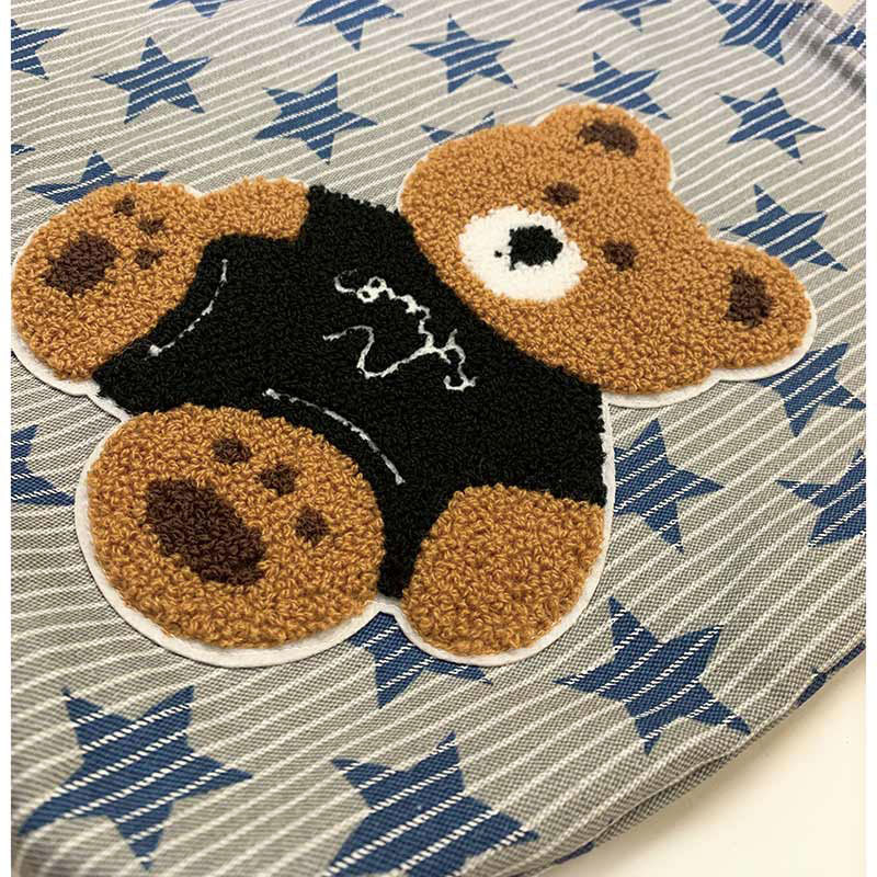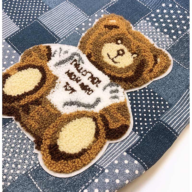 Bags with the fluffy bear patch that looks like it was embroidered with a punching needle.