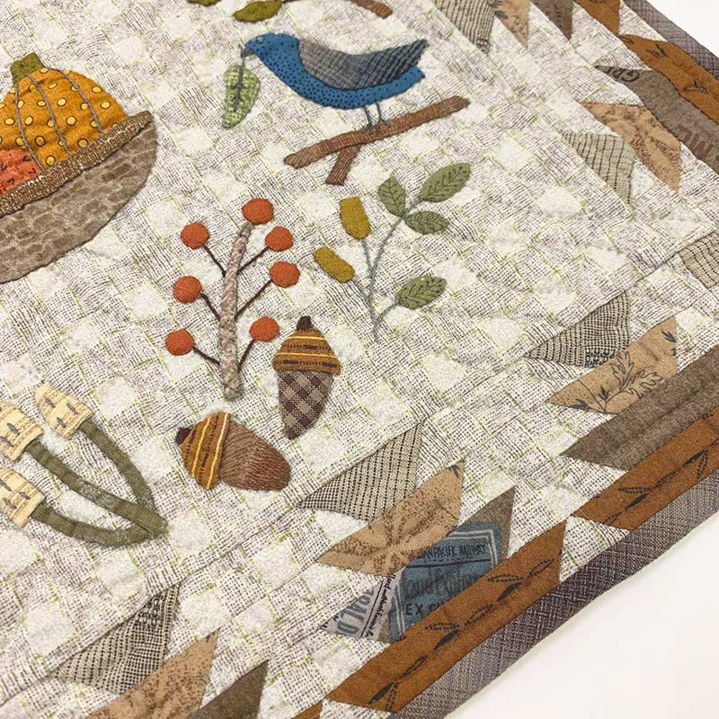 Pumpkins, acorns, mushrooms, and more are appliqued in autumnal colors.