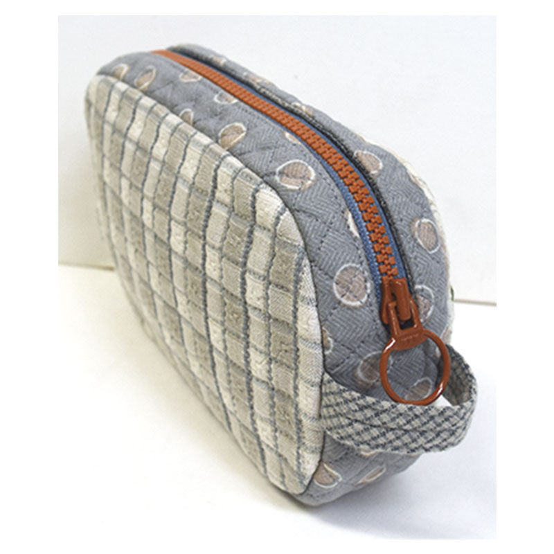 [Kit contents] Fabrics (outer, backing), embroidery thread, fusible interfacing, zipper,  English instruction, photo