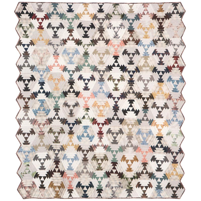 This quilt is made by piecing dark and light fabrics alternately from the center triangle like a log cabin pattern.