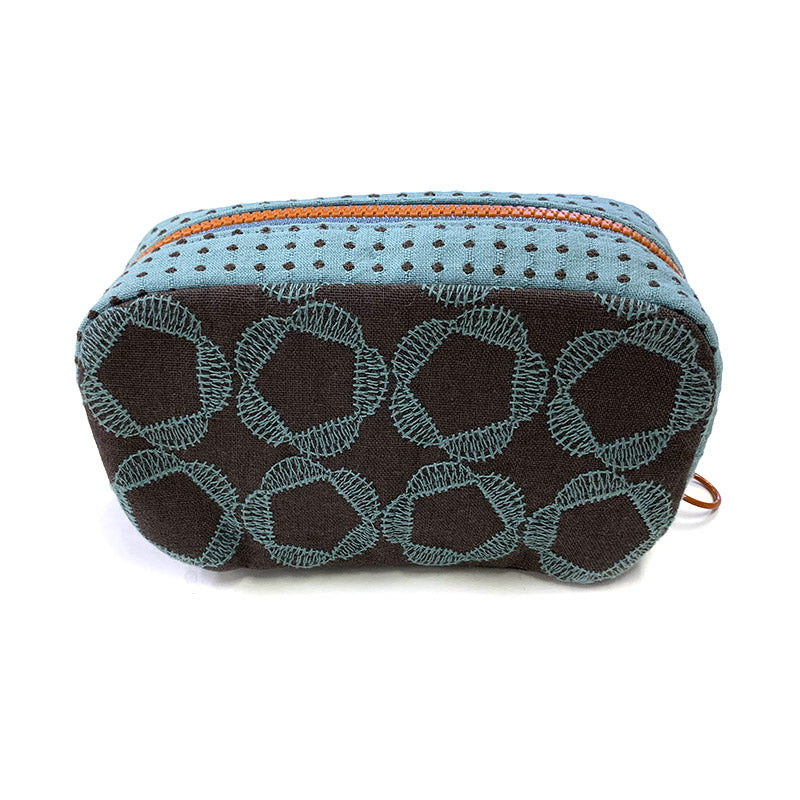 Material kit contents: Embroidered fabric, dots fabric, brown pre-dyed woven fabric, double-sided fusible batting, double-sided fusible sheet, zipper