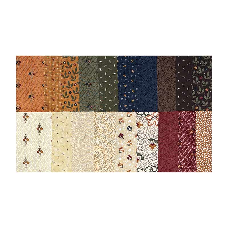 US print fabric with 19 antique-style small fabrics in muted colors.