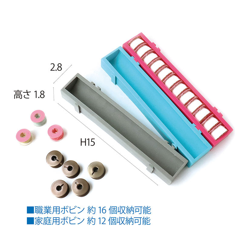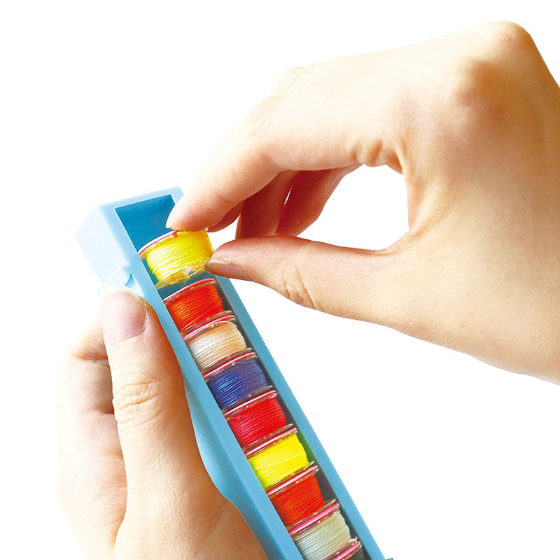 Size and number of stored bobbins: 12 household bobbins (φ20.5 x H11.5mm) / 16 Professional bobbins (φ21.2 x H9.2mm)