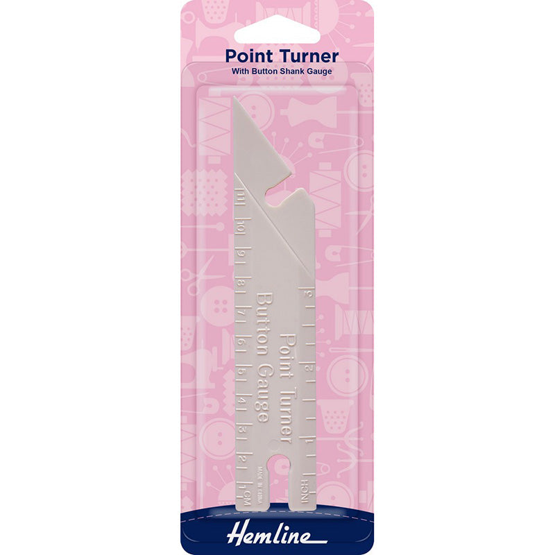 1. Gives a professional finish to collars, cuffs, pouches. Use to form crisp points and well-shaped pocket and garment turnings by gently shaping from the inside. Incorporates a Button Gauge to create button shanks.